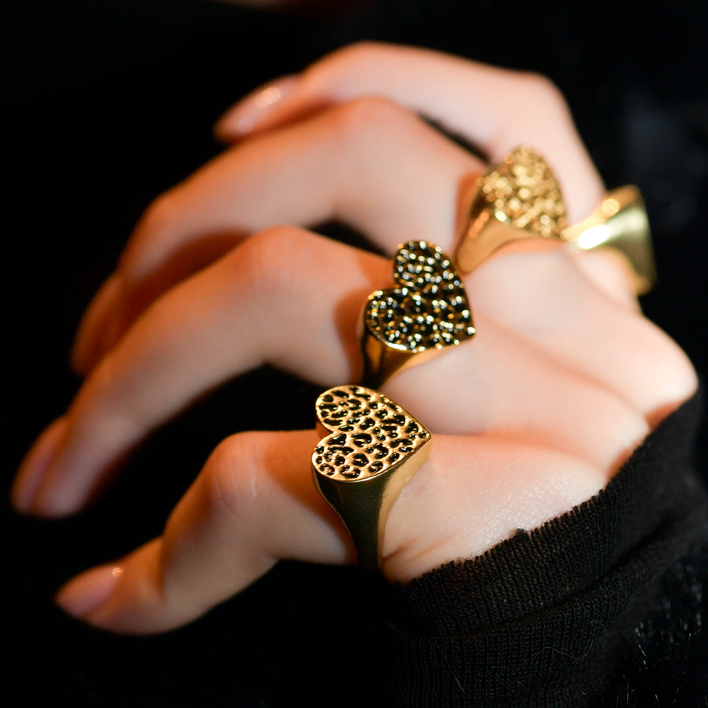 Cette bague dorée dialogue alors avec des pièces plus fines, cette bague chevalière coeur s’équilibre avec des lignes plus épurées. Noir, beige, blanc cassé : le motif léopard s’accorde avec les tons neutres, magnifie les matières naturelles et sublime la lumière.