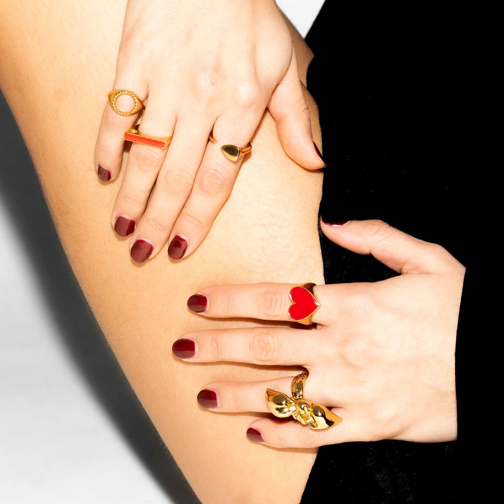 The COEUR signet ring in its simplest form. The design of its lines and its proportions, as common as they are unique, have quickly made this COEUR ring an ICONIC IT of the ERITA brand! In Paris red, a chic and frivolous version par excellence!