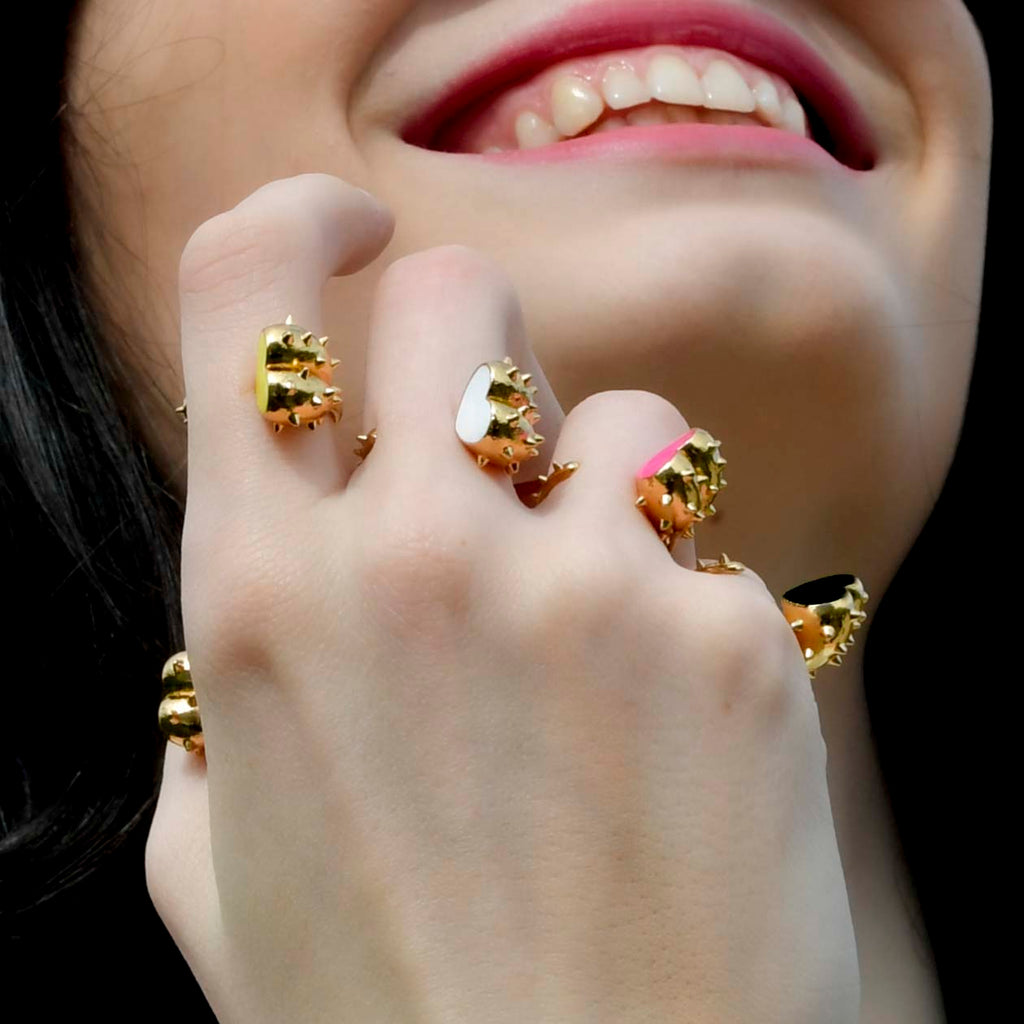 A golden heart ring twisted by mini-spikes to say how much passion can sting!!! The timeless black emphasizes the feminine curves and sharp lines of this "cactus" heart ring. A vibrant contrast for a chic and assertive style!!!