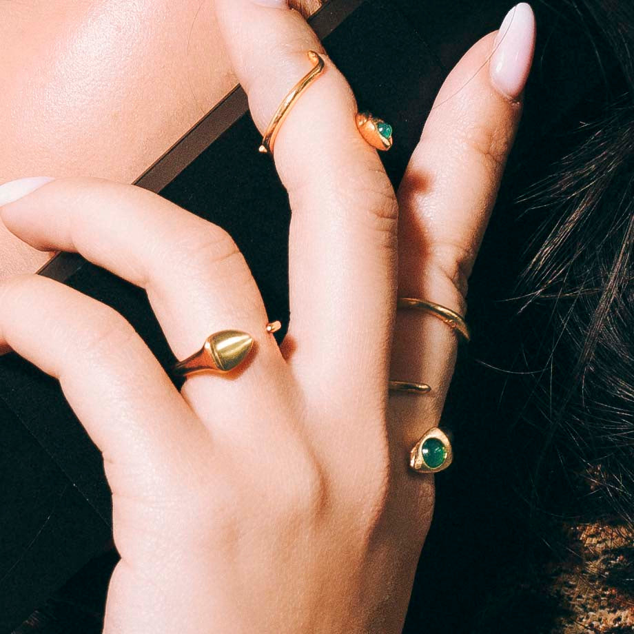 An XL snake ring that intertwines on the finger, a sharp design + a green agate stone = A modernized neo-vintage look! A smooth body, adjusted lines, this golden toi & moi ring is a racy, ultra-contemporary version of the timeless snake ring.
