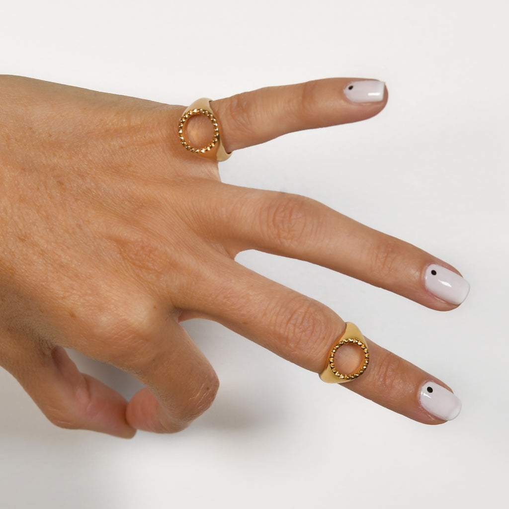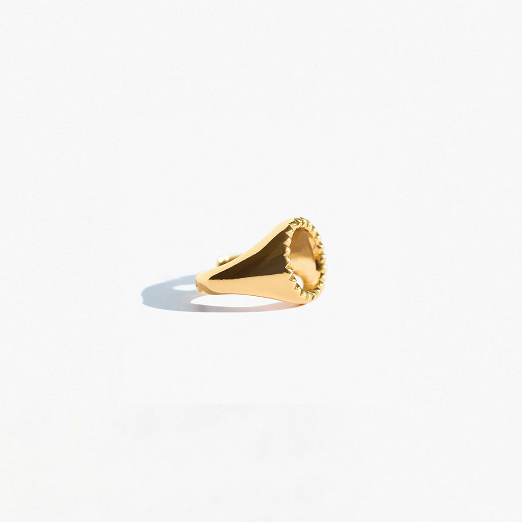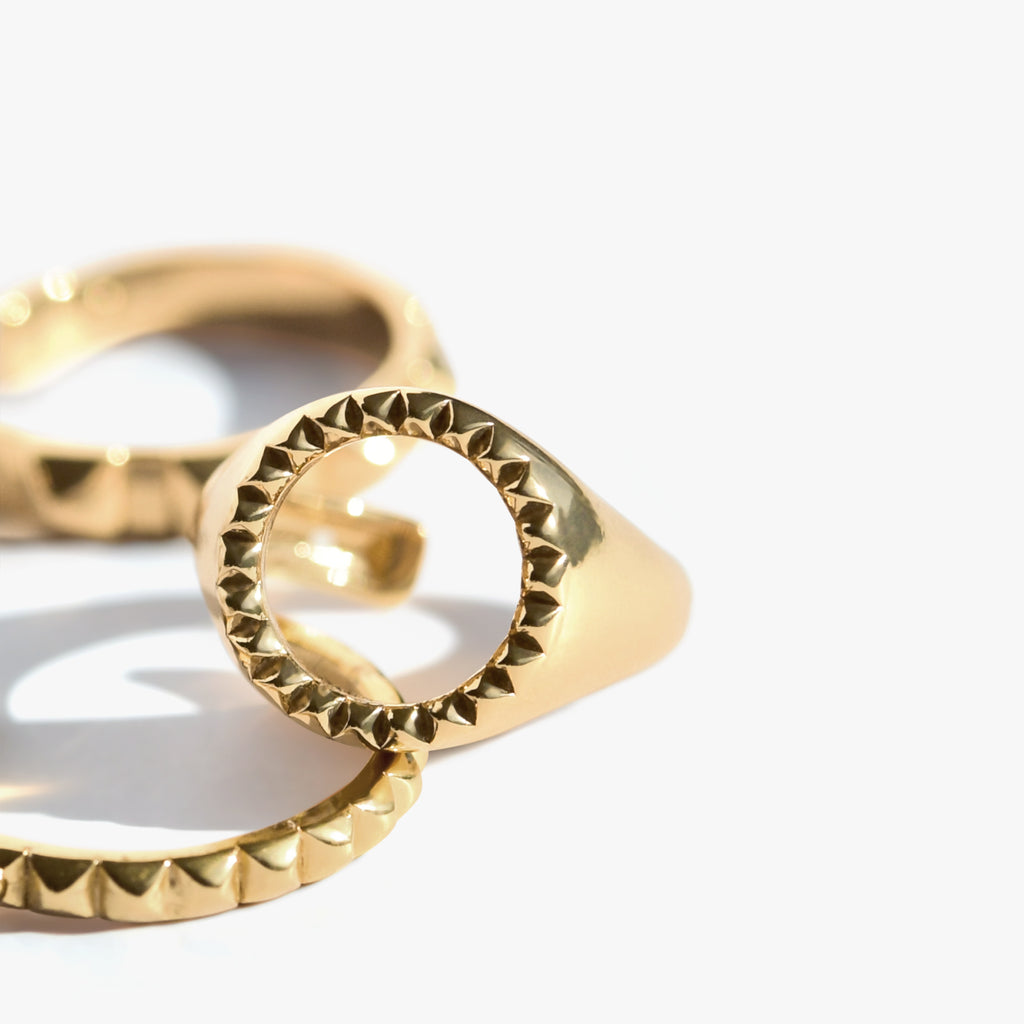Surmontée de mini studs, cette bague Chevalière laisse entrevoir la peau, comme une empreinte. Révélatrice de notre identité, une bague dorée "peau" réunit en un seul design la délicate force des femmes...Idéale sur tous les doigts, et toutes les phalanges.