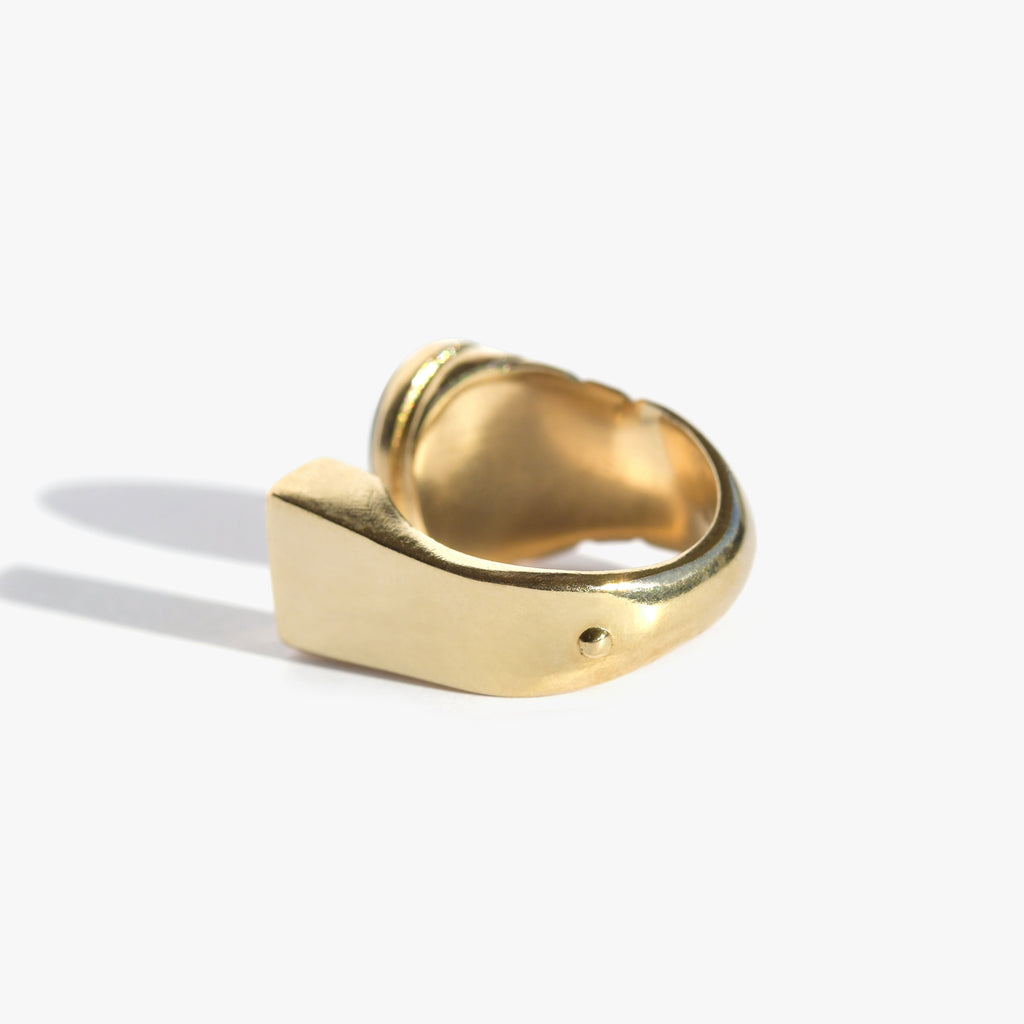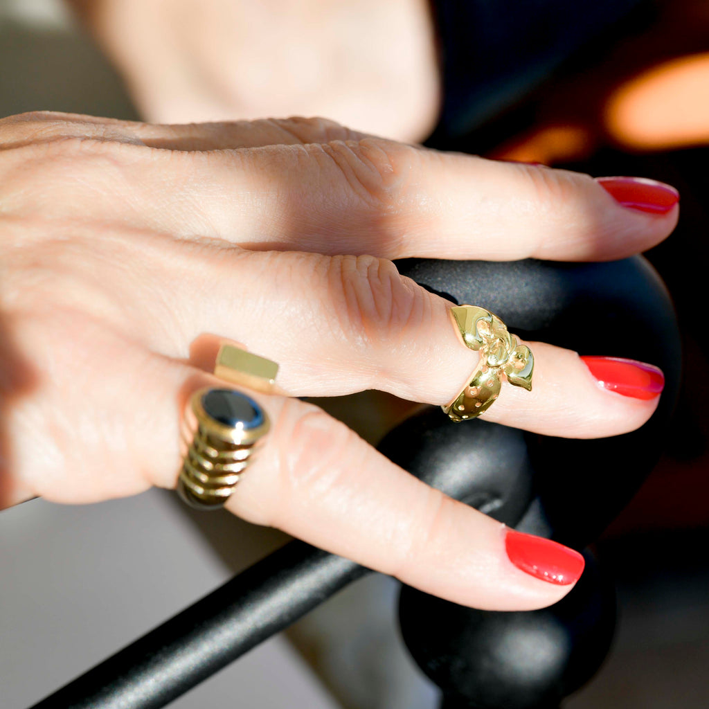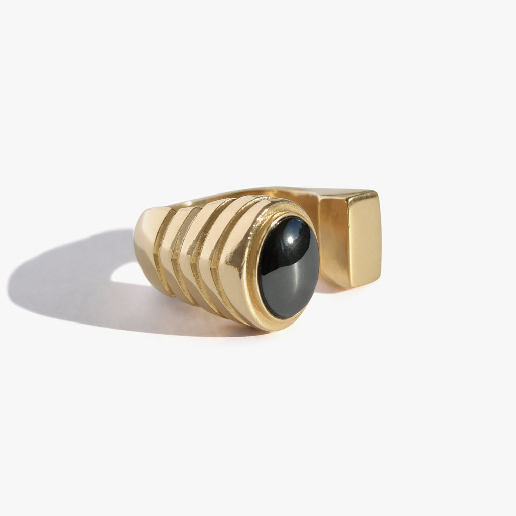 Une bague chevalière dorée ouverte, un cabochon Hématite, un cadre gold : Un face à face graphique métallique qui affiche nos belles contradictions.