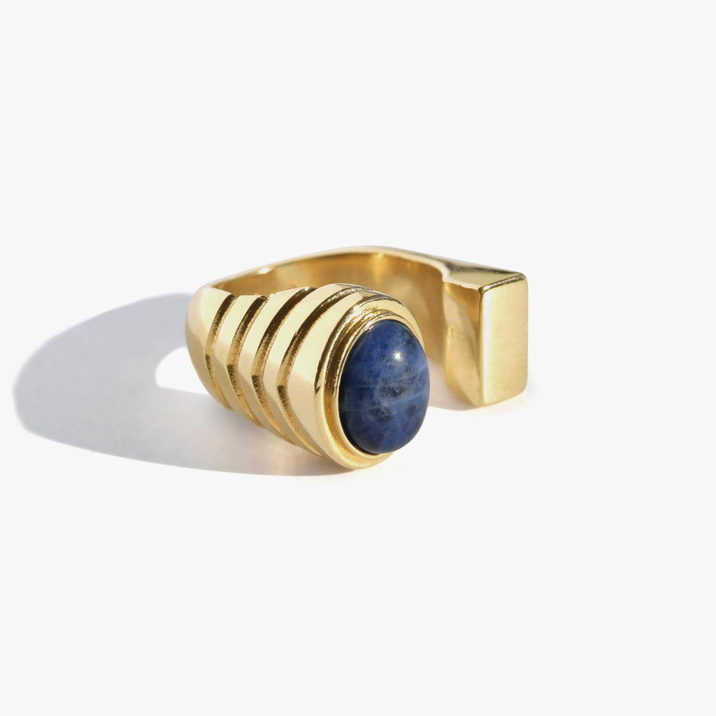 Cette bague chevalière dorée ouverte oppose un cabochon pierre Sodalite ovale et un cadre gold. Un face à face graphique stylé qui affiche nos belles contradictions.