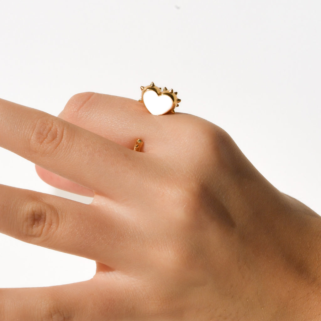 Une bague coeur dorée twistée par des mini-spikes pour dire combien la passion peut piquer !!! La douceur du blanc dénote avec les lignes pointues de cette bague coeur "cactus"... un contraste aussi vibrant qu'intemporel !!!