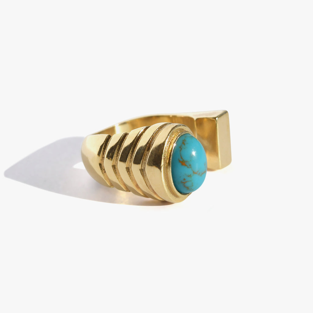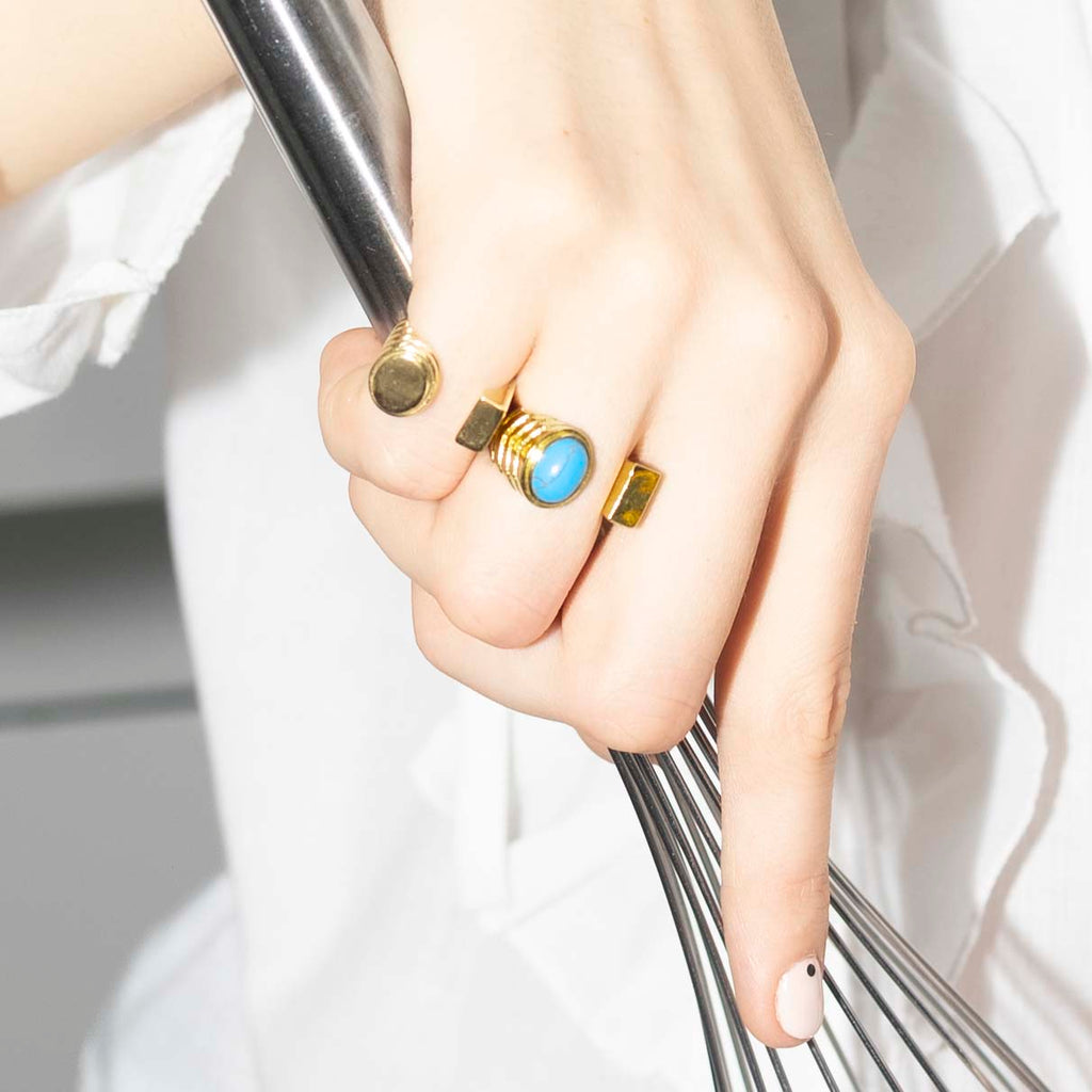 Cette bague chevalière dorée ouverte oppose un cabochon pierre Turquoise ovale et un cadre gold. Un face à face graphique stylé qui affiche nos belles contradictions.