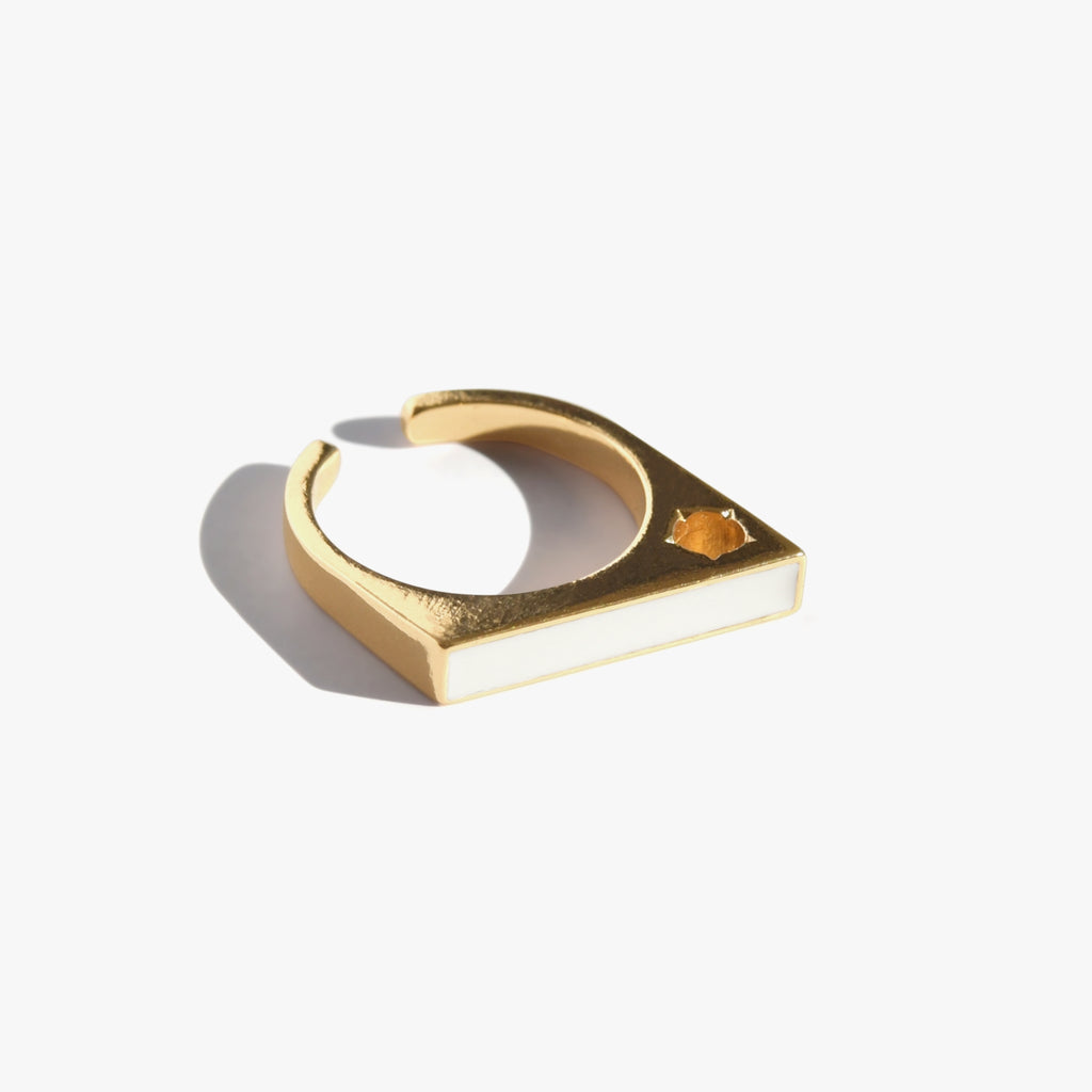 Une bague dorée droite mais ponctuée, un peu comme nous toutes ! Cette bague chevalière possède un léger élan qui fait toute sa différence. Impossible de faire l'impasse sur l'émail BLANC, le classique intemporel...