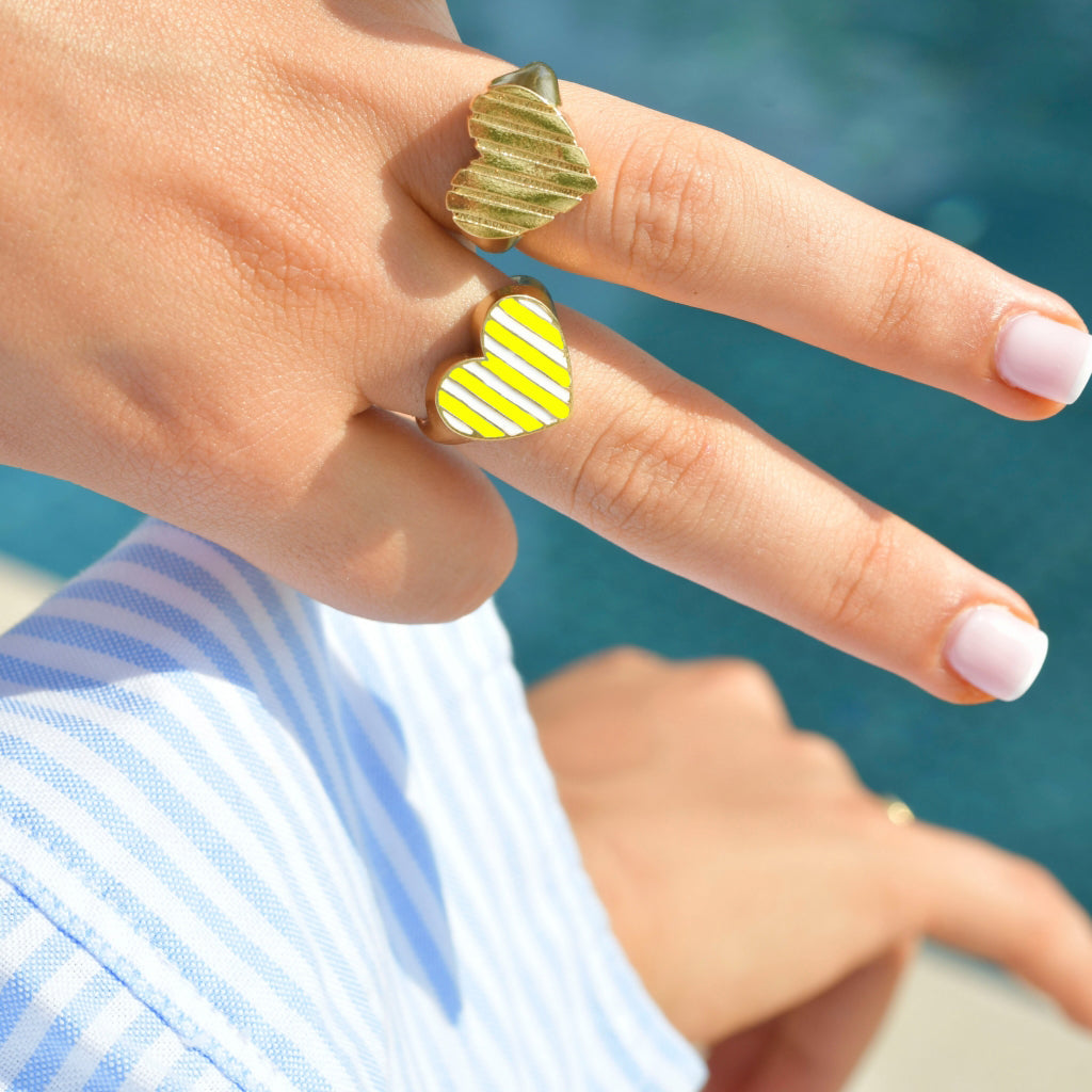 La bague chevalière Coeur La Môme dorée jaune et blanc est une bague créée en édition limitée ERITA x LA MÔME. Un air d'été, de bien être, de plaisir et de fête au bout des doigts !!!