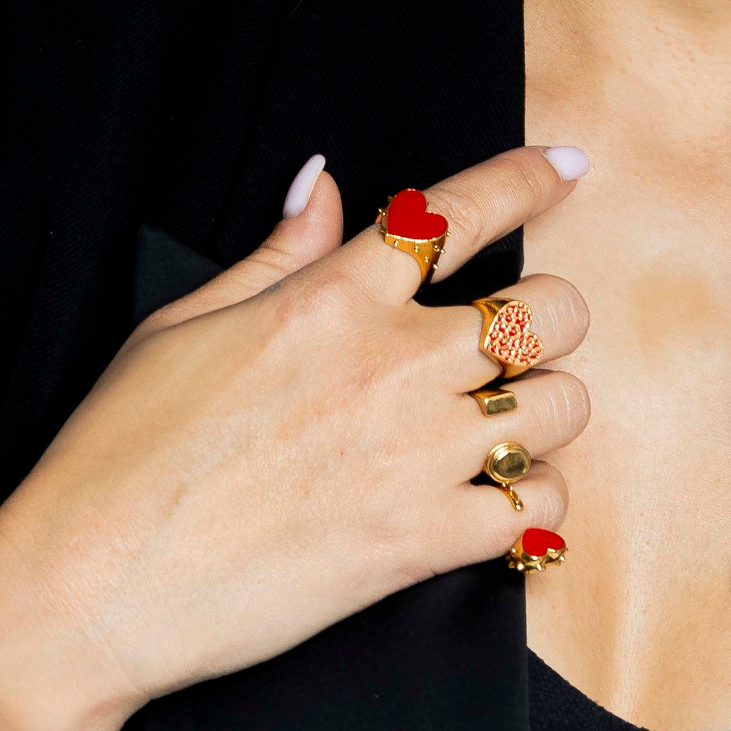 La bague chevalière Coeur Léopard rouge dit notre côté "animal" et haut en couleur. Cette bague coeur dorée au contraste inattendu, au design aussi POP qu'épuré, est devenu iconique !! LA griffe animale, incontournable, quelque soit notre style, était indispensable à notre vestiaire, elle est le modèle ADN de la marque. Cette chevalière dorée est LA dose "sauvage" idéale en version ROUGE FERRARI...!!!