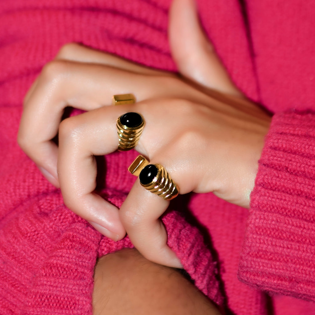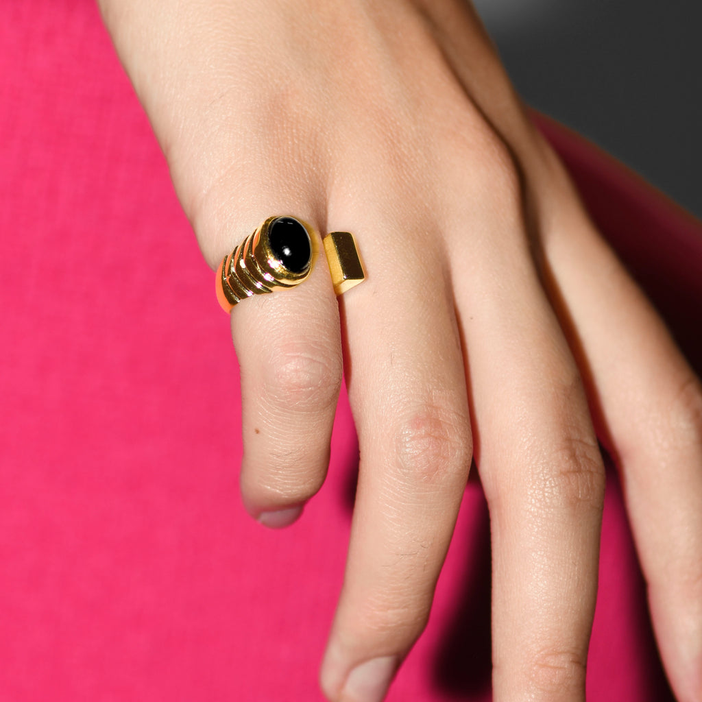 Cette bague chevalière dorée ouverte oppose un cabochon pierre Agate noire ovale et un cadre gold. Un face à face graphique stylé qui affiche nos belles contradictions.