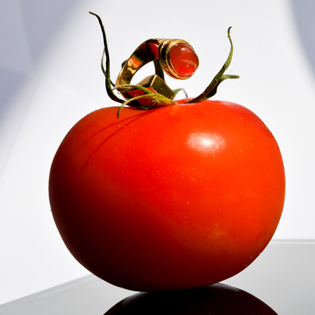 Des lignes brisées, une forme enveloppante, le métal froid, une pierre chaude ….autant de contrastes, qui font de cette bague chevalière rouge un essentiel. Une "Hot Touch" au bout des doigts.