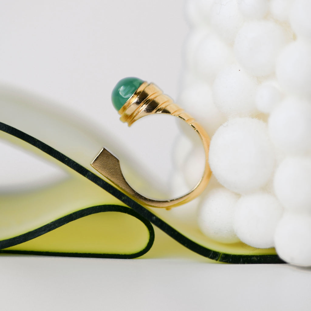 Cette bague chevalière dorée ouverte oppose un cabochon pierre Agate verte ovale et un cadre gold. Un face à face graphique stylé qui affiche nos belles contradictions.