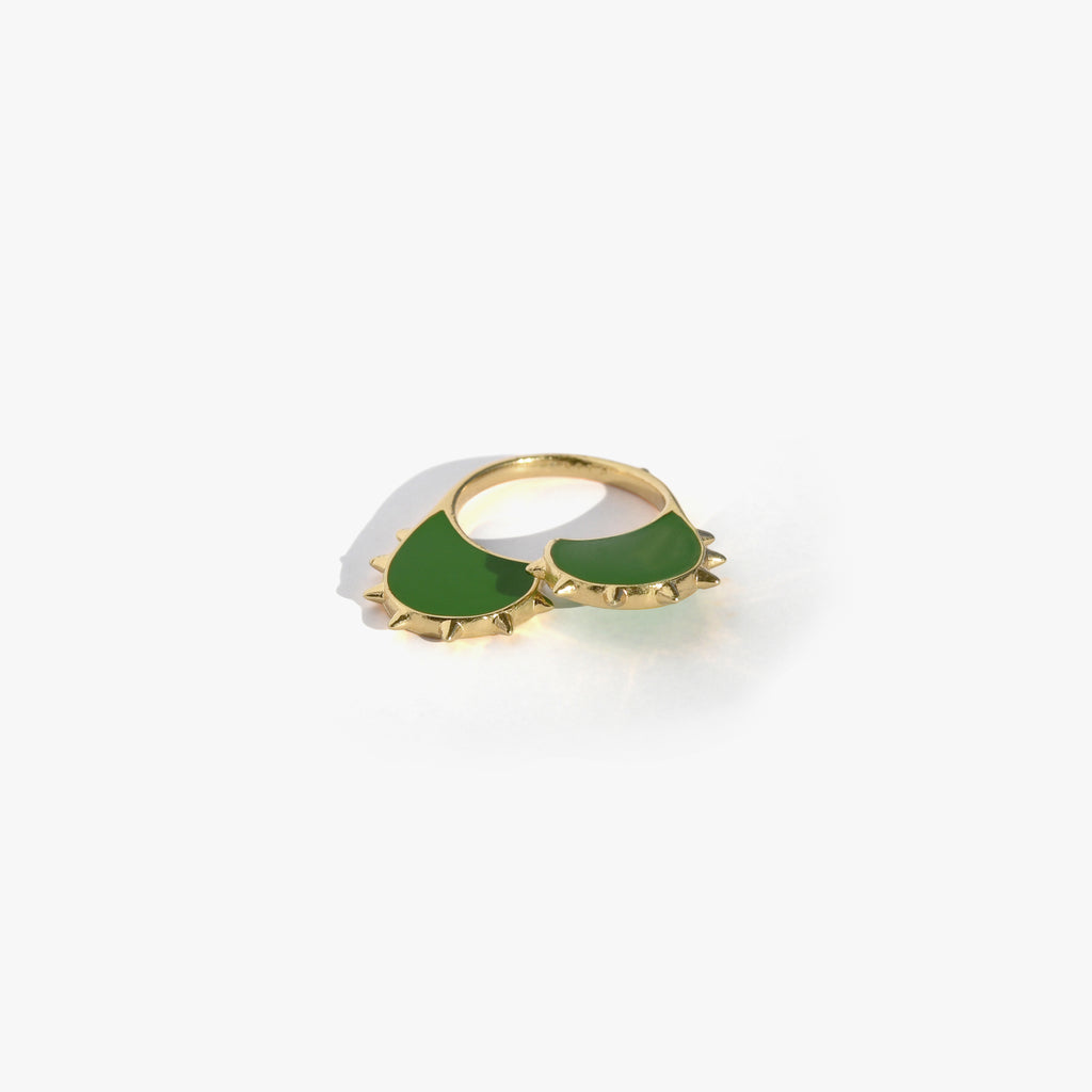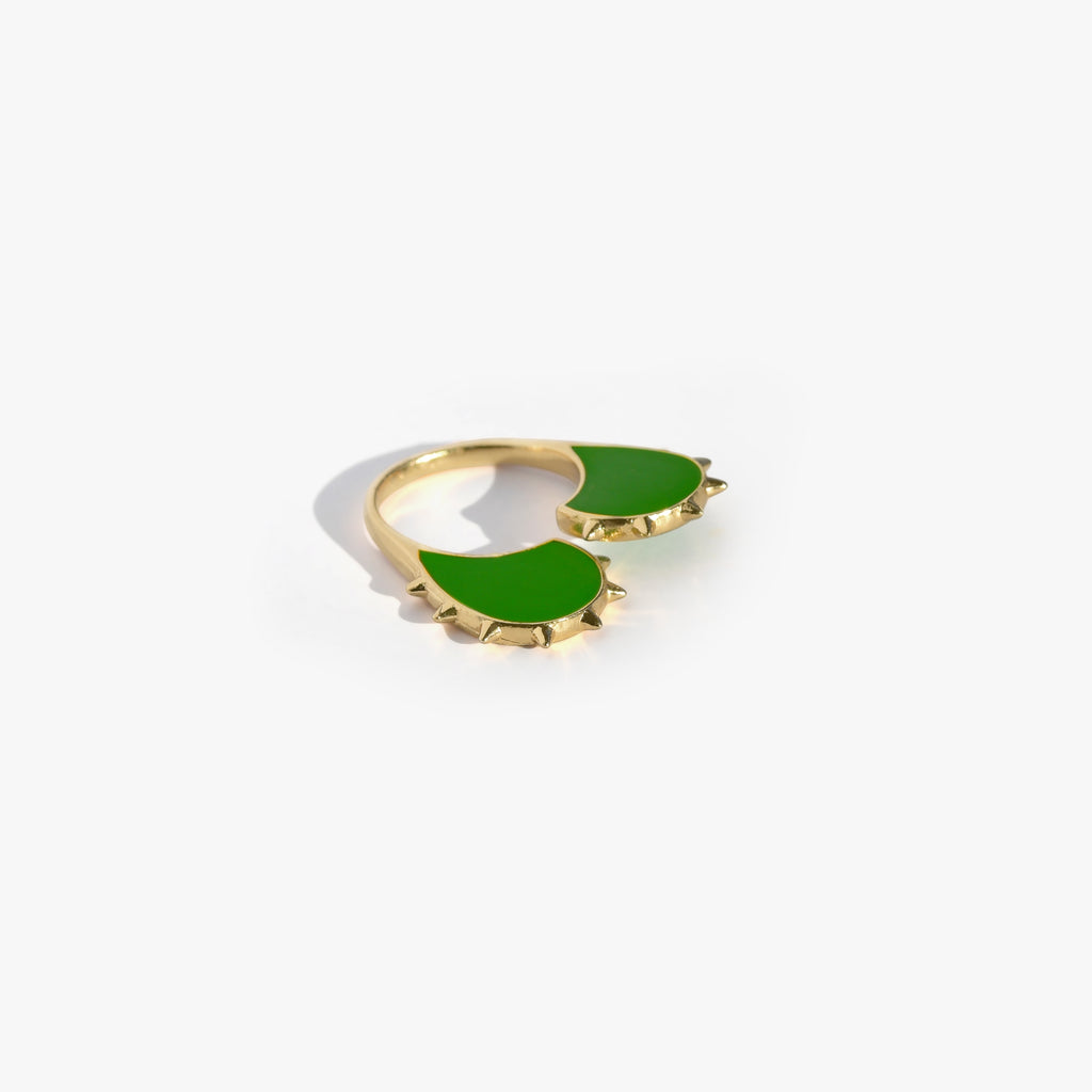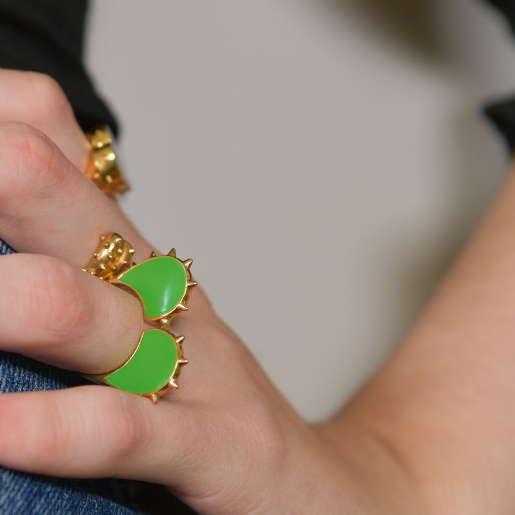 Une bague coeur dorée, comme une armure, qui prend de la hauteur et montre ses "piques". Des mini spikes délicats, un design ultra original, en vert néon...une bague ouverte en version "GREEN" idéale pour un style délicat un tantinet rebelle !