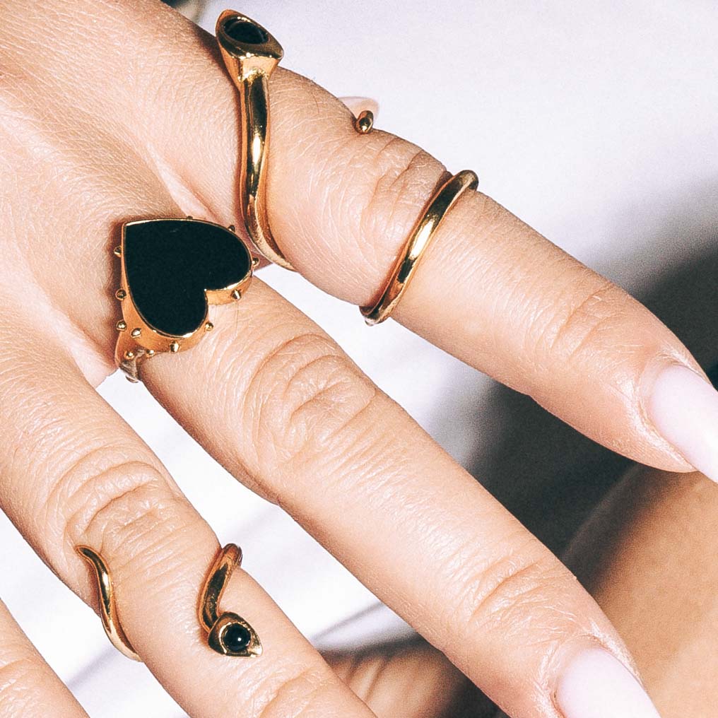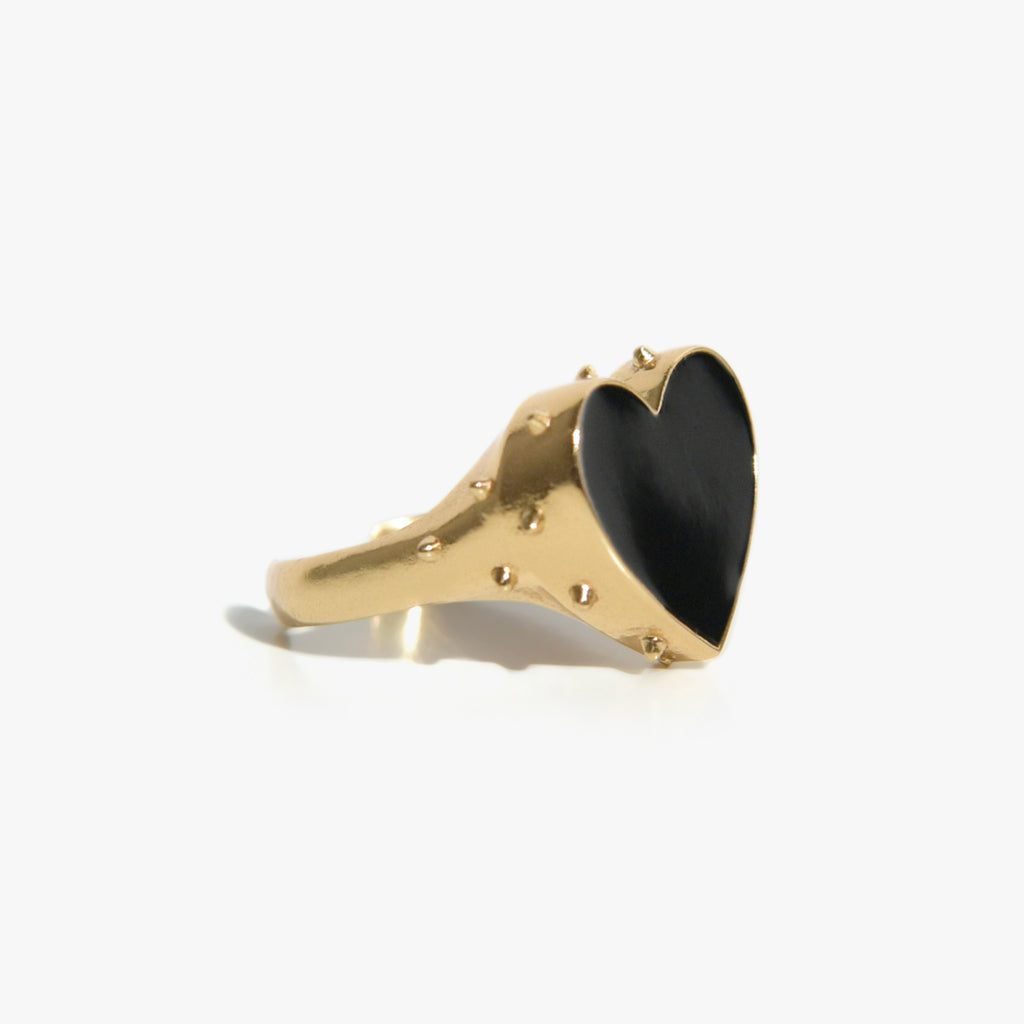 PASSIONNER Bague Chevalière Bague coeur dorée & émail noir volume L