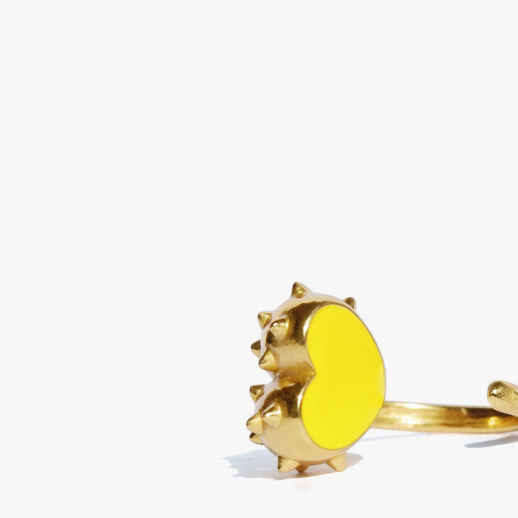 Une bague coeur dorée twistée par des mini-spikes pour dire combien la passion peut piquer !!! Le Jaune solaire, fait vibrer les courbes féminines et les lignes pointues de cette bague coeur "cactus". Un contraste rayonnant pour un style affirmé !!!
