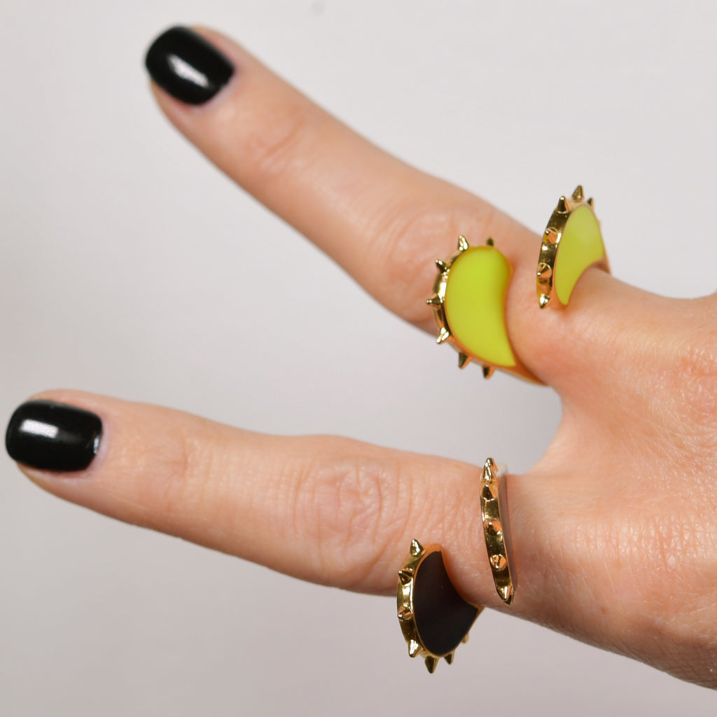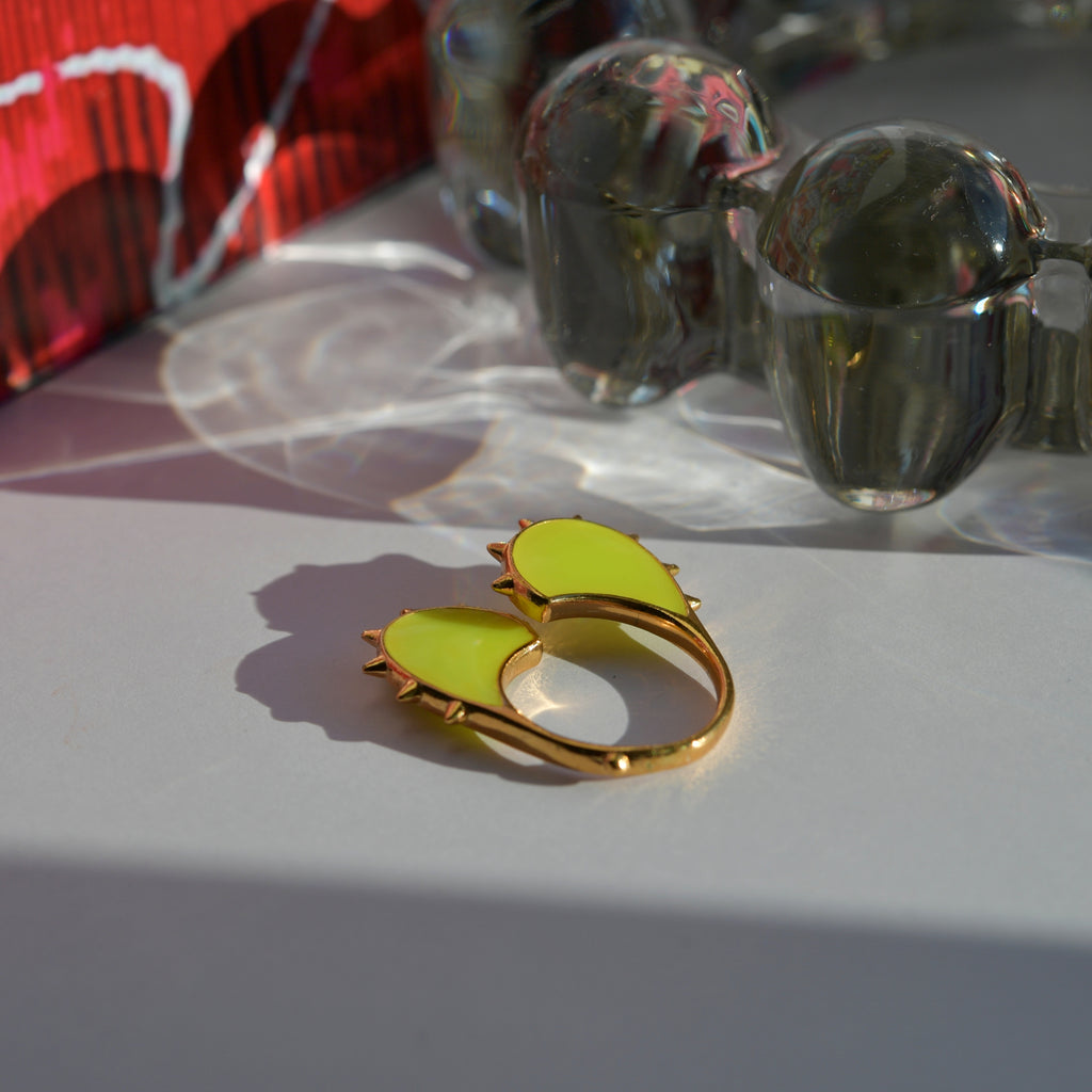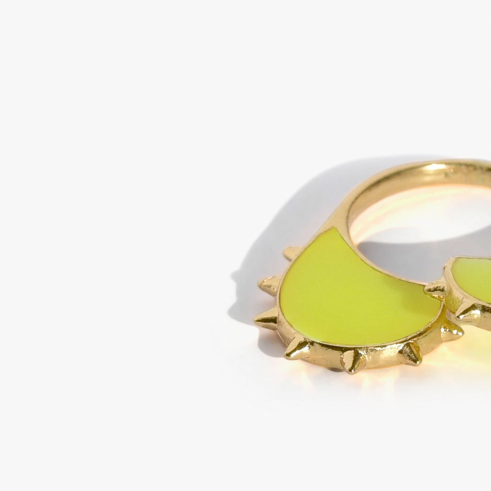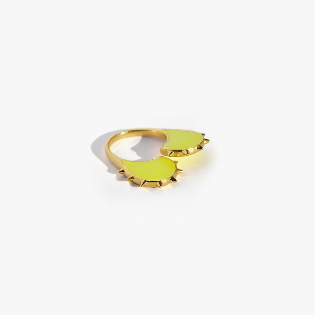 Une bague coeur dorée, comme une armure, qui prend de la hauteur et montre ses "griffes". Des mini spikes délicats, un design ultra original, twistés par le Jaune ERITA, ce jaune franc et pétillant identitaire de la marque...la combinaison idéale pour RAYONNER avec délicatesse & un soupçon de rock and roll !