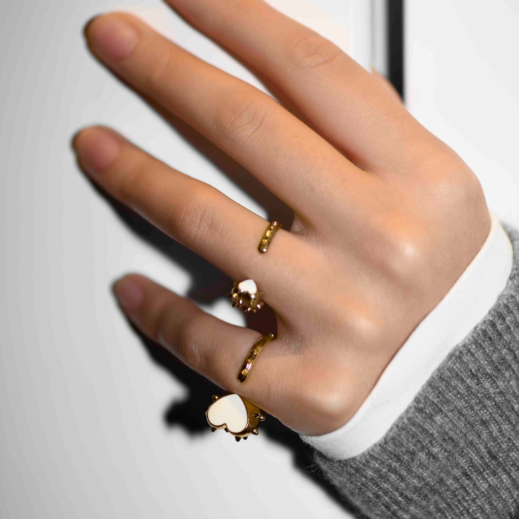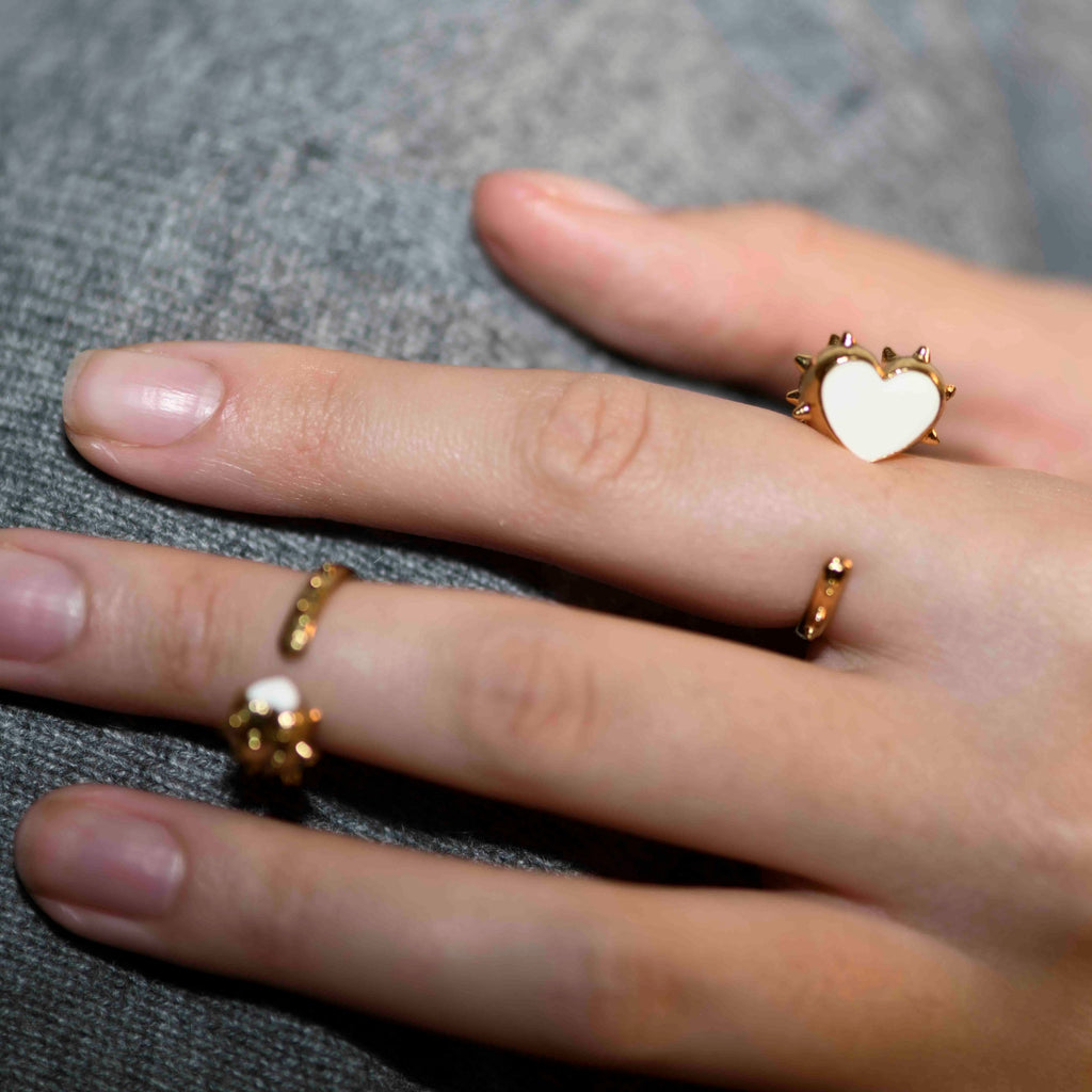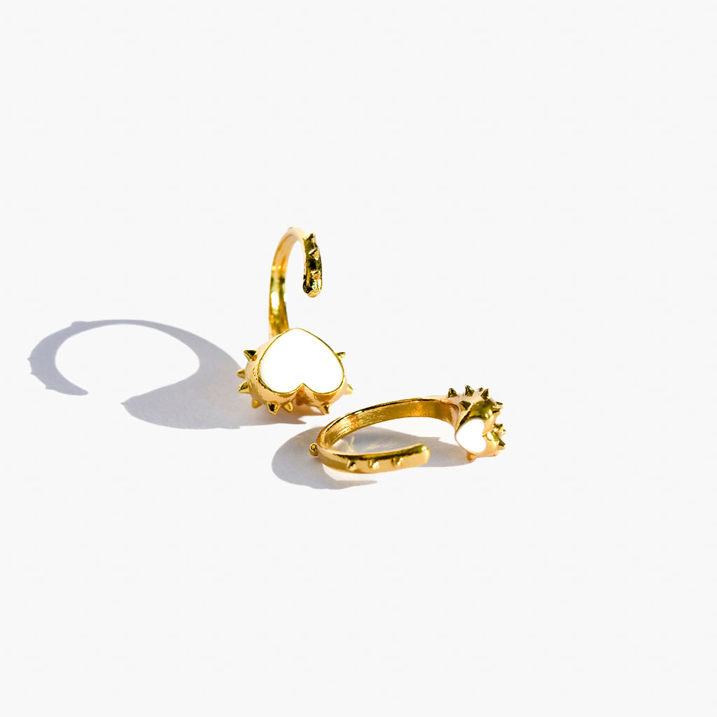 Un duo de bagues coeur doré, émail blanc et des mini-spikes, pour signer un style passionné avec raffinement. La douceur du coeur blanc laiteux dénote avec ces lignes affutées, un contraste aussi vibrant qu'intemporel qui apporte du caractère à toutes vos silhouettes.