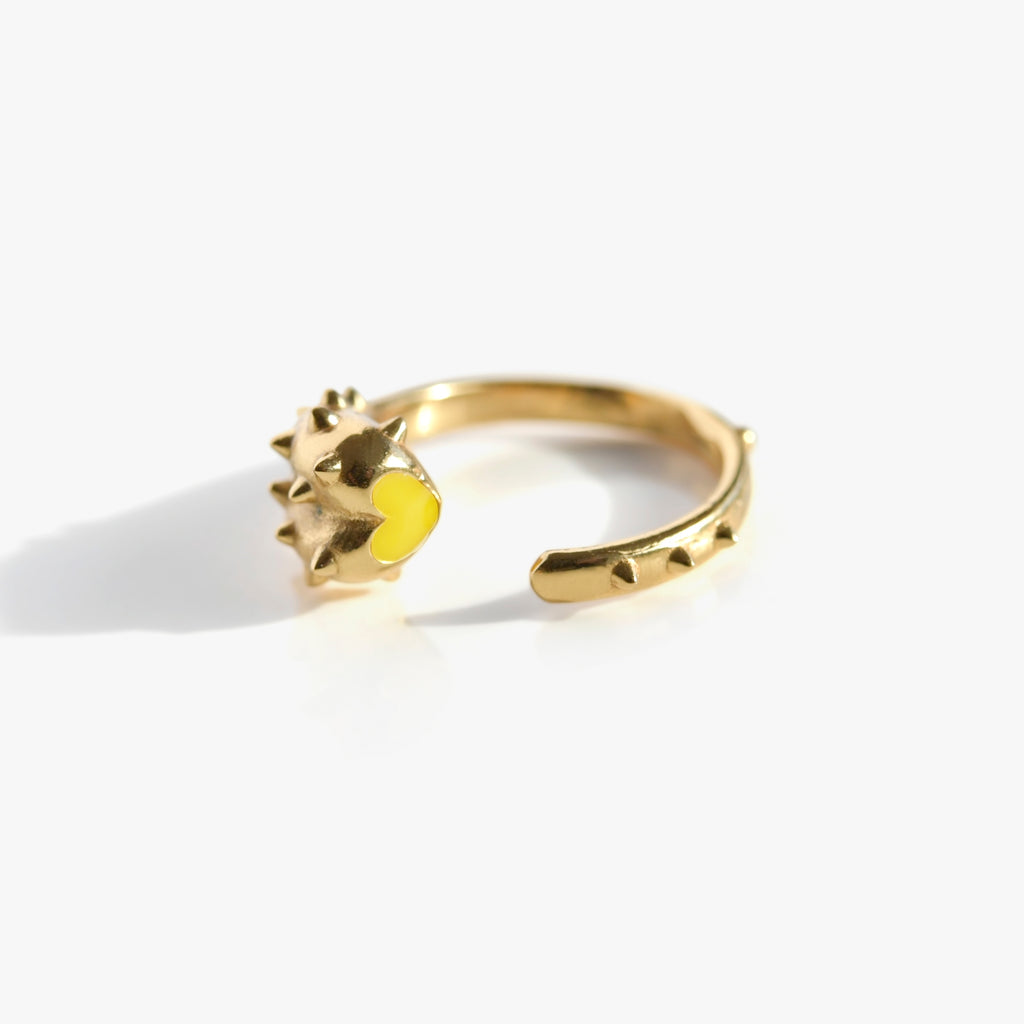 Un duo de bagues coeur doré, émail jaune et des mini-spikes, pour signer un style passionné avec raffinement. La douceur du coeur, la chaleur du jaune dénotent avec des lignes affutées, un contraste vibrant qui apporte du caractère à vos silhouettes, même les plus classiques.