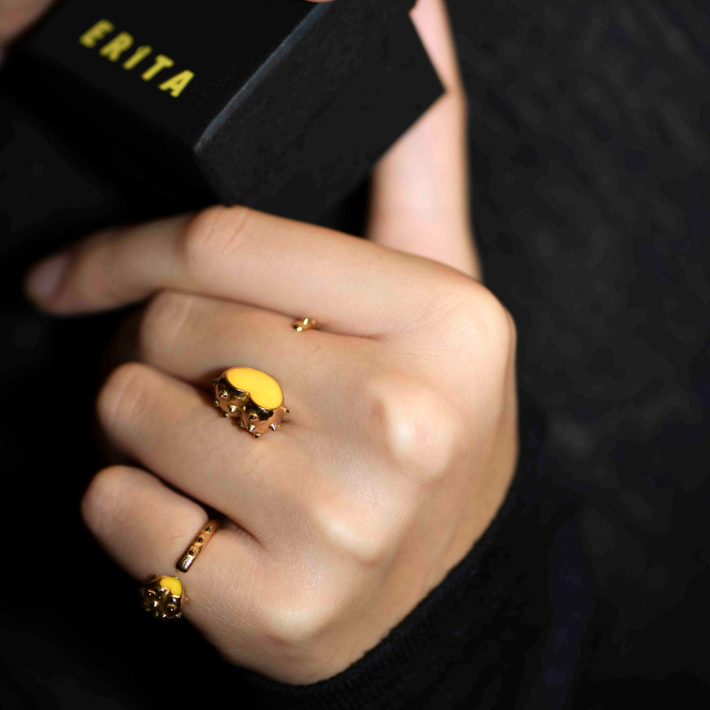Pour préserver votre set de bagues PASSIONNER ERITA dorées et émail jaune, conservez-les dans un endroit sec et évitez l’humidité.