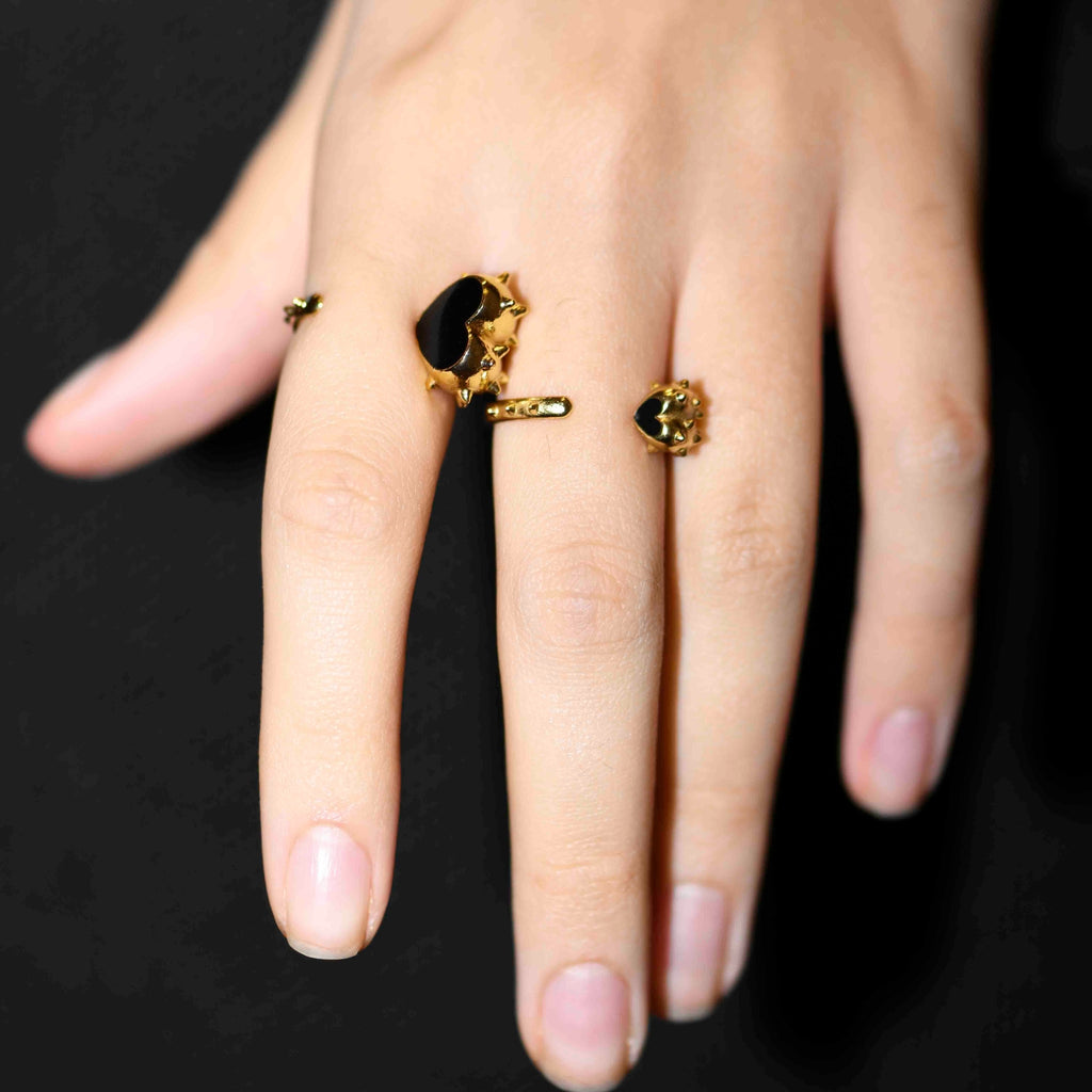 Le plus : Ces bagues ajustables dorées et noires au volume original se portent seules ou en accumulation, de jour comme de nuit. Des bagues premium qui s'adaptent à tous vos doigts et finissent tous vos looks avec caractère.