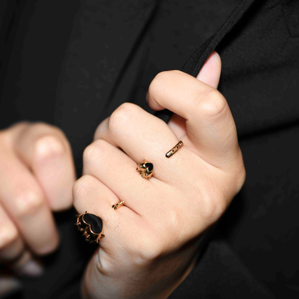 Un duo de bagues coeur doré, émail noir et des mini-spikes, pour signer un style passionné avec raffinement. La douceur du coeur, la profondeur du noir dénotent avec les lignes pointues, un contraste aussi vibrant qu'intemporel qui apporte du caractère à toutes vos silhouettes.