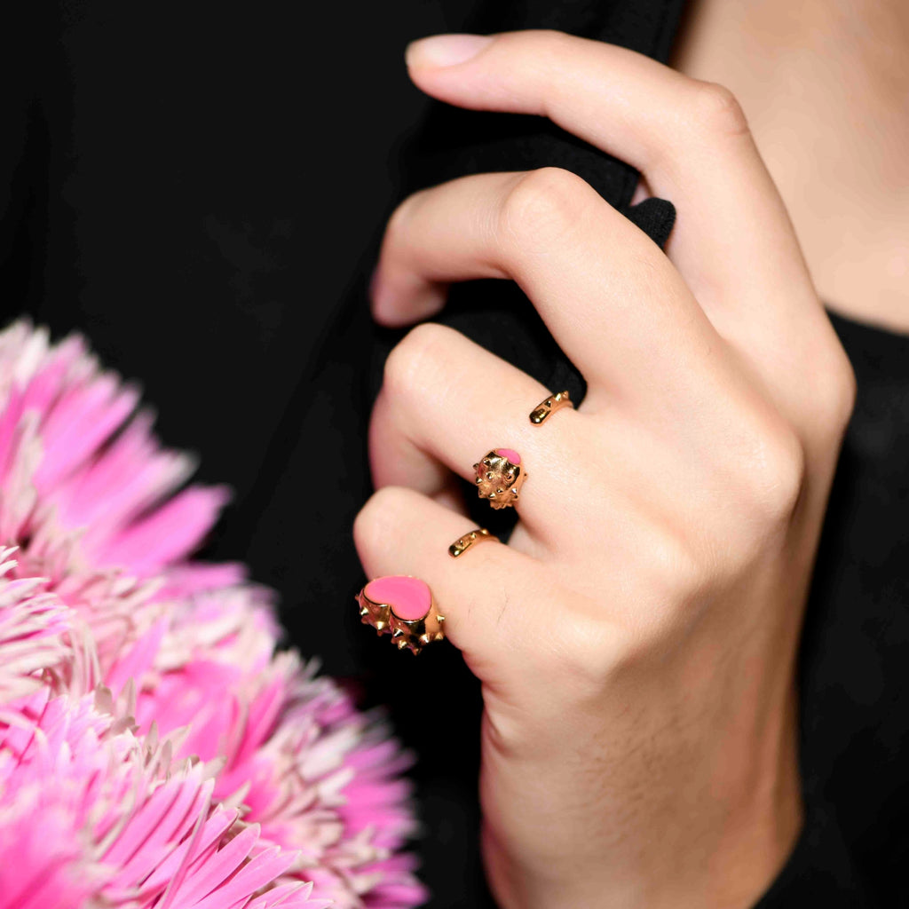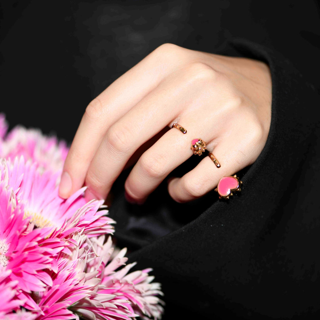 Un duo de bagues coeur doré, émail rose et des mini-spikes, pour signer un style passionné avec raffinement. Un coeur rose qui vient adoucir des lignes affutées, un contraste vibrant qui apporte du caractère à vos looks, même les plus basiques.