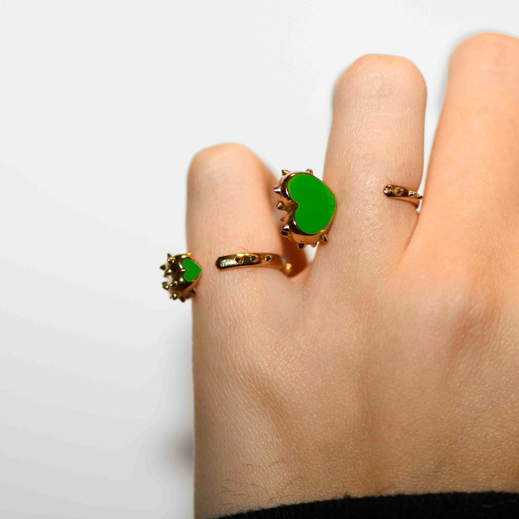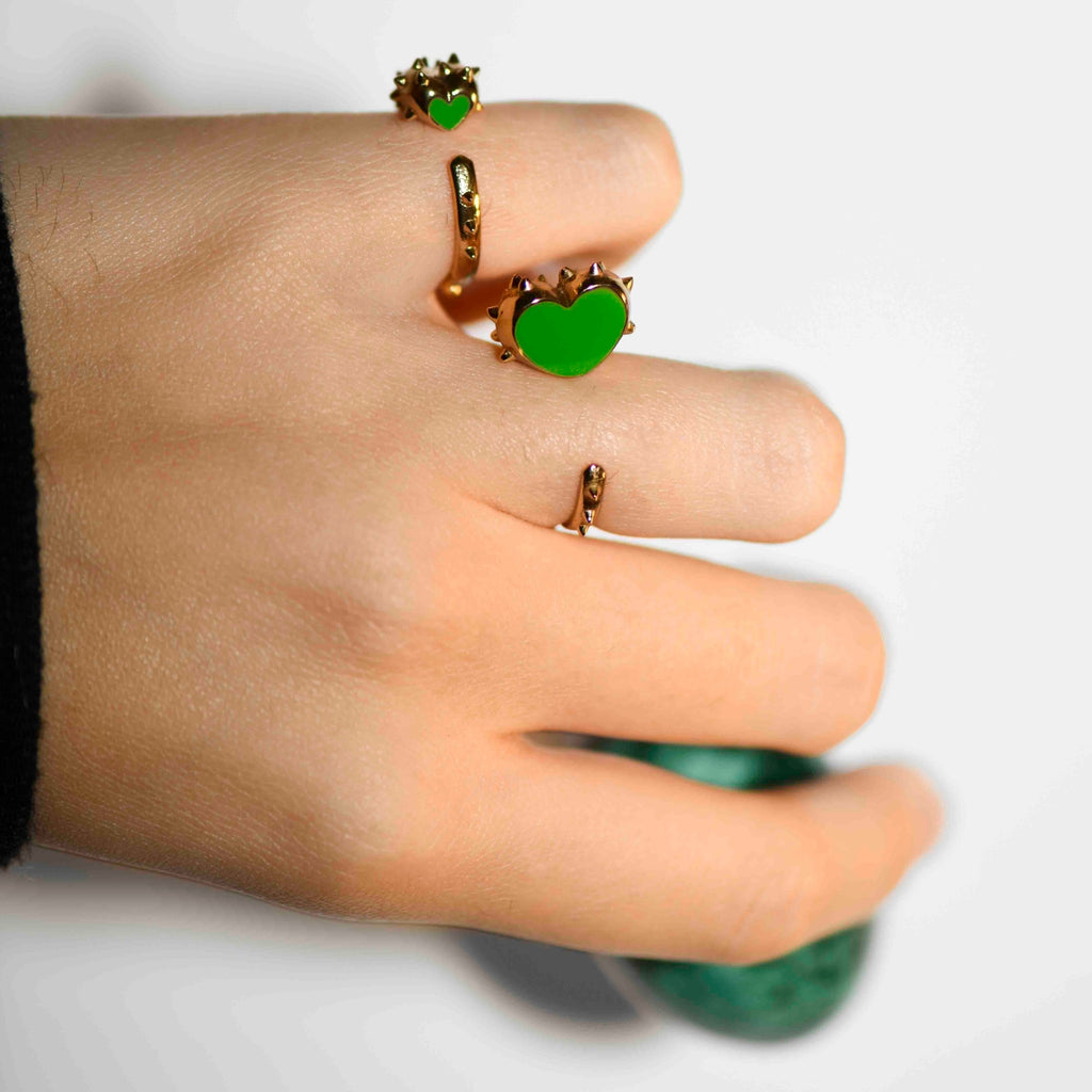 Un duo de bagues coeur doré, émail vert et des mini-spikes, pour signer un style passionné avec raffinement. La douceur du coeur, le pop du vert dénotent avec ces lignes affutées, un contraste vibrant qui apporte du caractère à vos silhouettes, même les plus basiques.