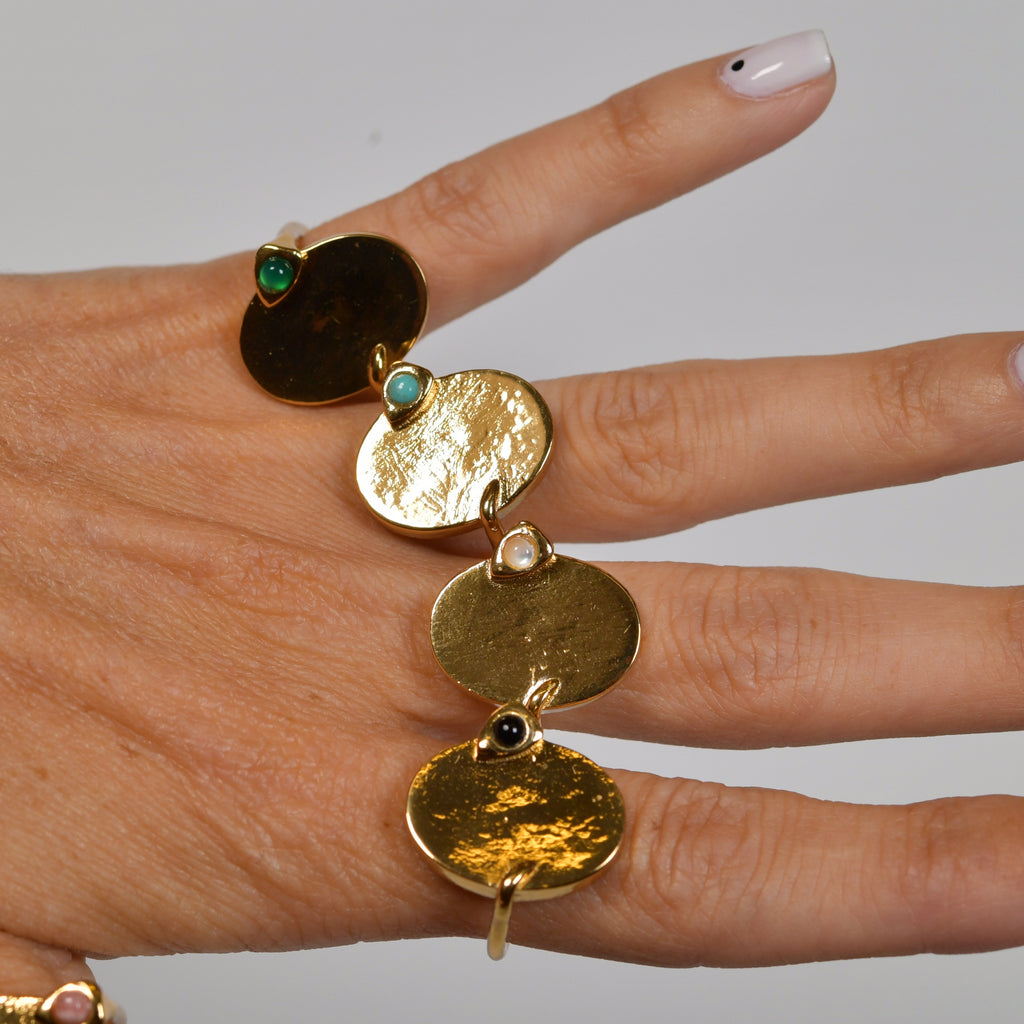 Faites à la main, avec des matériaux naturels, pour préserver leur authenticité et leurs imperfections, chaque bague en laiton doré ERITA est une bague originale et unique.