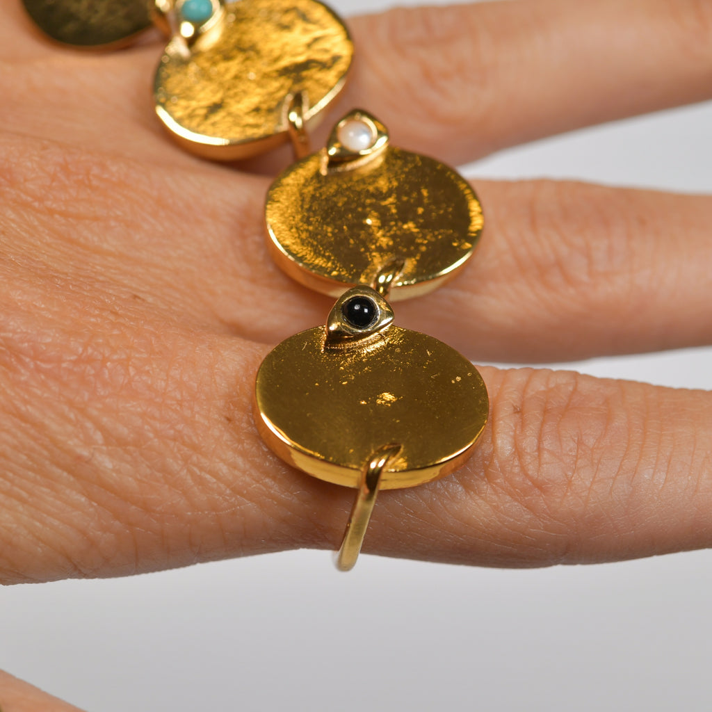 Faites à la main, avec des matériaux naturels, pour préserver leur authenticité et leurs imperfections, chaque bague en laiton doré ERITA est une bague originale et unique.