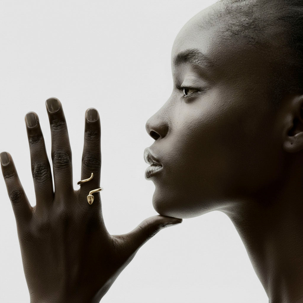 Symbole de transformation et de puissance, notre bague Serpent s’enroule autour du doigt comme un lacet sculptural. Cette bague dorée, à la fois épurée et audacieuse, affirme une présence immédiate — portée seule pour un geste aussi raffiné, qu'assumé ou en accumulation pour un impact plus fort.
